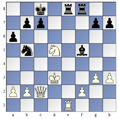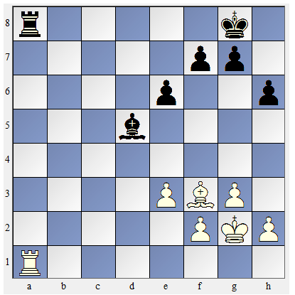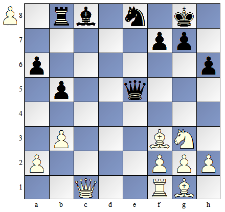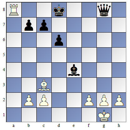 ![]() | Zadanie 2 Szpila. Czarny goniec dał szacha. Biały król musi odejść. Nawet kiedy będzie bronił hetmana, to czarne zyskają, wymieniając gońca za hetmana. |