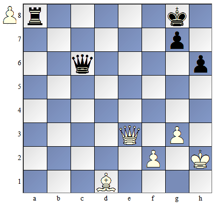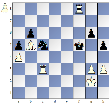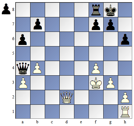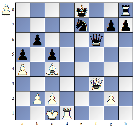 ![]() | Zadanie 1 Szpila. Biała wieża dała szacha. Czarny król musi odejść, a kiedy to zrobi, czarny hetman zostanie stracony. |