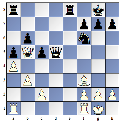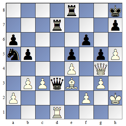 ![]() | Zadanie 3 Szpila. Białe, grając gońcem na f3, atakują hetmana. Hetman - jako bardziej wartościowa figura - stał się ofiarą szpili. Musi odejść, by poświęcić mniej wartościową wieżę. |