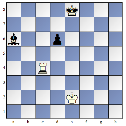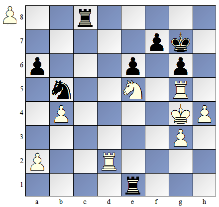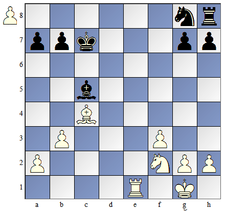 Czarny skoczek został związany! Nie może uciec, gdyż nie może odsłonić ataku (szacha) na króla! O takim związaniu mówimy, ze jest to związanie całkowite (zupełne), bo figurą osłaniana jest król. Bez względu co zagrają czarne, biała wieża zbije skoczka: |