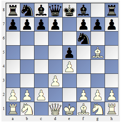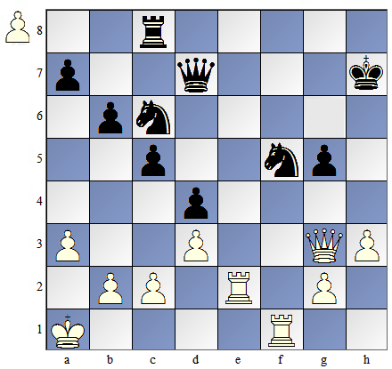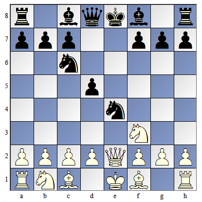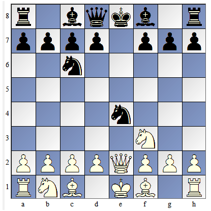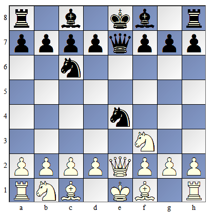 ![]() | Białe postawiły hetmana na e2 (5. H e2) i związały skoczka. Skoczek nie może odejść, bo odsłoniłby szacha. |