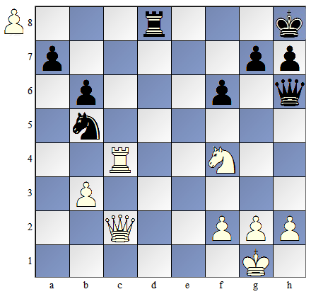 ![]() | Zadanie 3. Czarny goniec związał białego skoczka. Nie stanowi to jednak problemu. Skoczek i goniec stanowią mniej więcej tę samą wartość (po 3 punkty), a skoczek jest broniony przez pionka. Jest to nieszkodliwe związanie. |