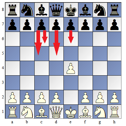 Najpopularniejszą odpowiedzią jest ruch 1. .. c5 (obrona sycylijska), 1. ..e6 (obrona francuska), 1. .. c6 (obrona Caro-Kann), a nawet 1. .. d5 (obrona skandynawska) [patrz diagram]. |