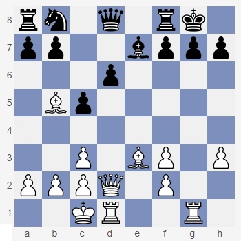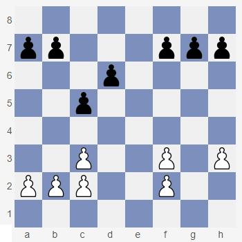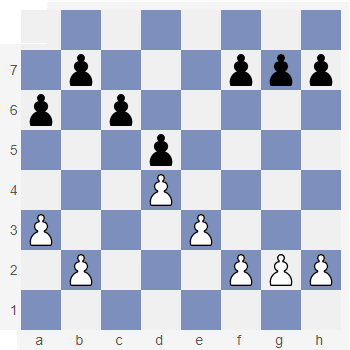Spójrz na diagram obok. Łańcuch pionków czarnych od b7 do d5 skierowany jest na skrzydło królewskie. Taki łańcuch nazywany jest łańcuchem pionka d5. Plany czarnych są tu proste: atak figurami na skrzydle królewskim, zanim białe rozbiją łańcuch czarnych pionów. Plan białych też jest prosty i wyznaczony kierunkiem łańcucha pionków białych (od f2 - pionek bazowy, do d4). Białe rezygnują z ataku na pozycję czarnego króla i starają się uzyskać przewagę na skrzydle hetmańskim. Jednym z planów białych jest próba rozbicia czarnego łańcucha pionów marszem piona po kolumnie b. Przypomnij sobie ten sposób gry z Lekcji P 30 Ciekawostka: taki układ pionków zwany jest strukturą karlsbadzką. |