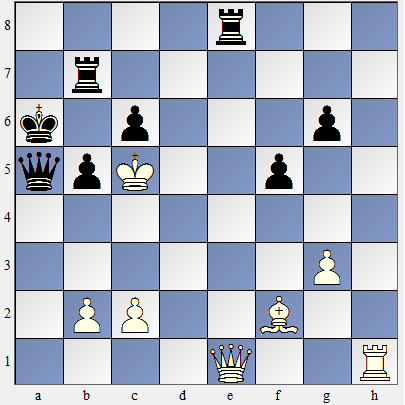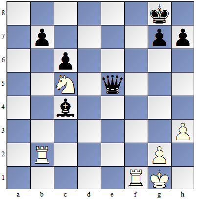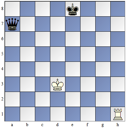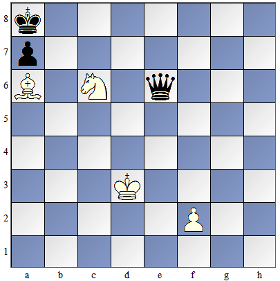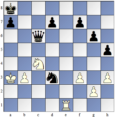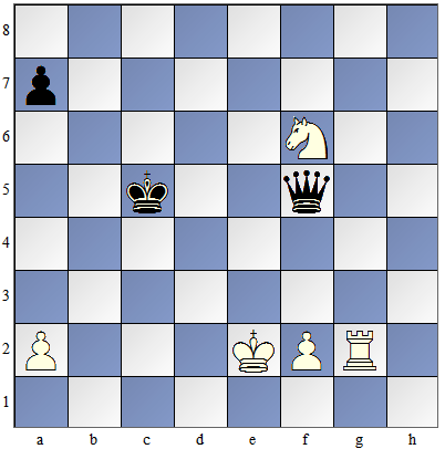 Popatrz na diagram obok. Wieża atakuje króla grając 1. We8 + i zmusza go do zajęcia pola Kb7. Na tym polu jest obiektem podwójnego uderzenia: Sa5!. |