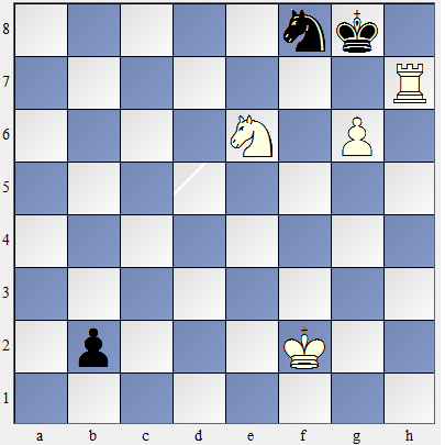 Popatrz na diagram obok. Wieża atakuje króla grając 1. Wh8 +. Król nie ma innej możliwości, jak zbić tę wieżę .. K:h8. Został zaciągnięty na pole, na którym będzie obiektem podwójnego ataku: 2. g7+. Król nie może bić pionka, gdyż jest broniony przez skoczka. Po ucieczce - np. ...Kh7, pionek bije czarnego skoczka i promuje się na hetmana! 3. g:f8H. Kiedy czarne też dokonają promocji .. b1H, białe dadzą mata. 3. Hg7#. Kiedy jednak czarne spróbują ucieczki Kg6, białe zastosują podwójne uderzenie 3. Hg7+ - zaatakuje jednocześnie króla i pionka. |