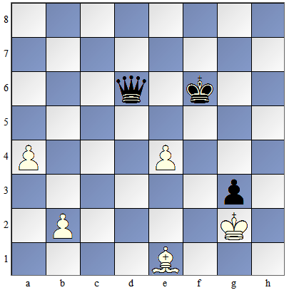 Popatrz na diagram obok. Wieża atakuje króla grając 1. We8 +. Kiedy król ucieknie na Kh7 białe będą mogły zastosować związanie: Ge4!. Na tej samej przekątnej zaatakują hetmana i króla. |