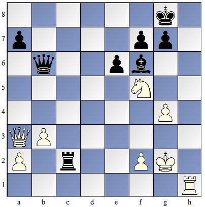 Popatrz na diagram obok. Wieża białych idzie na h8 - 1. Wh8 + daje szacha. Tym samym zmusza króla do wejścia na siódmą linię (np. ..Kf7, na której znajduje się już hetman. Teraz białe wykorzystują kolejny motyw taktyczny - szpilę! Wieża zagrywa: 2. Wh7! |