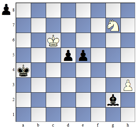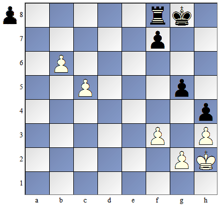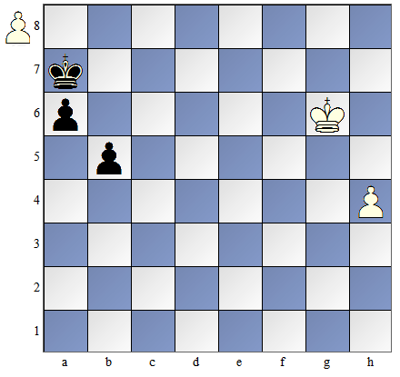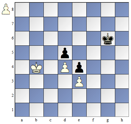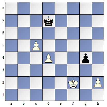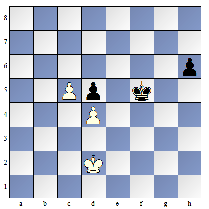 Posunięcie mają czarne. 1...Kf6 Czarny król nie może wejść na pole "e4" i zagrozić zabiciem piona d4, gdyż pionek na kolumnie „c" „uciekłby" do linii przemiany. Czarny król musi zatem poruszać się tylko po tych polach, które są w kwadracie piona ,c”, aby nie dopuścić do przesunięcia się tego piona do przodu. Białe mogą zbić wolnego piona czarnych i po tym mogą pomóc pionkowi z kolumny "c" na dojście do promocji. 2. Ke3 Kf5 3. Kf3 Kf6 4. Kf4 Ke6 5. Kg4 Kf6 6. Kh5 Kf5 7. K:h6 Kf6 |