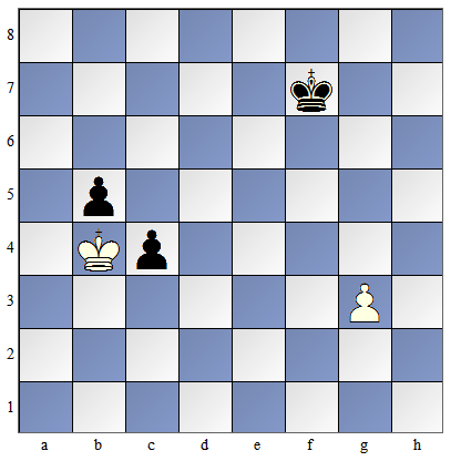 Popatrz na diagram obok. Jeżeli na posunięciu będą czarne, to król zbije pionka na f5 i nie wpusci białego króla na pola kluczowe. Jeżeli na posunięciu będą białe, to nie mogą teraz ruszyć królem - on nie zdąży obronić pionka na f5 i czarney król znów zablokuje pola kluczowe pionka stojącego na g2... |