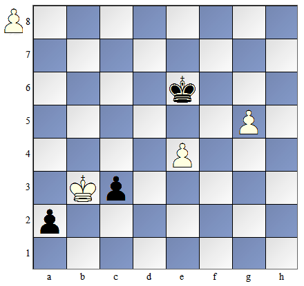 ![]() | Na diagramie obok białe mają dwa połączone piony, z których jeden jest wolnym pionem. Czarne mają także 2 piony, ale odległe od siebie, wymagające obrony przez króla. gdyż w przeciwnym razie będą zbite przez białego króla.